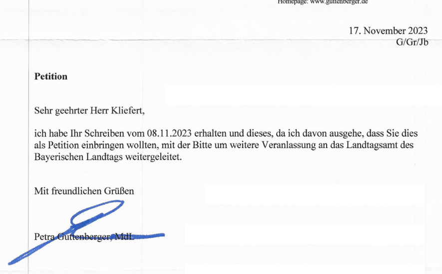 Die Vorsitzende des Ausschuss für Verfassung, Recht, Parlamentsfragen und Integration, Frau Petra Guttenberger, fasste mein Schreiben als Petition auf und reichte es als solche beim bayerischen Landtag ein. Sie schrieb mir am 17.11.2023: