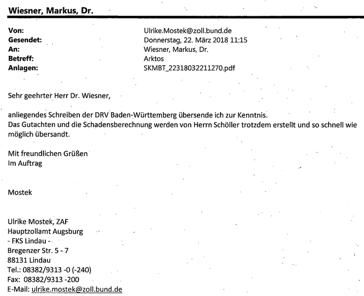 Sehr geehrter Herr Dr. Wiesner, anliegendes Schreiben der DRV Baden-Württemberg übersende ich zu Ihrer Kenntnis. Das Gutachten und die Schadensberechnung werden von Herrn Schöller dennoch erstellt und so schnell wie möglich übersandt. Mit freundlichen Grüßen Im Auftrag Mostek