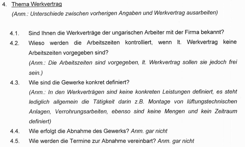 Thema Werkvertrag (Anmerkung: Unterschiede zwischen vorherigen Angaben und Werkvertrag sind auszuarbeiten) 4.1 Sind Ihnen die Werkverträge der ungarischen Arbeiter mit der Firma bekannt? 4.2 Wieso werden die Arbeitszeiten kontrolliert, wenn laut Werkvertrag keine Arbeitszeiten vorgegeben sind? (Anmerkung: Die Arbeitszeiten sind vorgegeben, laut Werkvertrag sollen sie jedoch frei sein.) 4.3 Wie sind die Gewerke konkret definiert? (Anmerkung: In den Werkverträgen sind keine konkreten Leistungen definiert; es steht lediglich allgemein die Tätigkeit darin, z. B. Montage von lüftungstechnischen Anlagen oder Verrohrungsarbeiten. Ebenso sind keine Mengen und kein Zeitraum definiert.) 4.4 Wie erfolgt die Abnahme des Gewerks? (Anmerkung: Gar nicht.) 4.5 Wie werden die Termine zur Abnahme vereinbart? (Anmerkung: Gar nicht.)